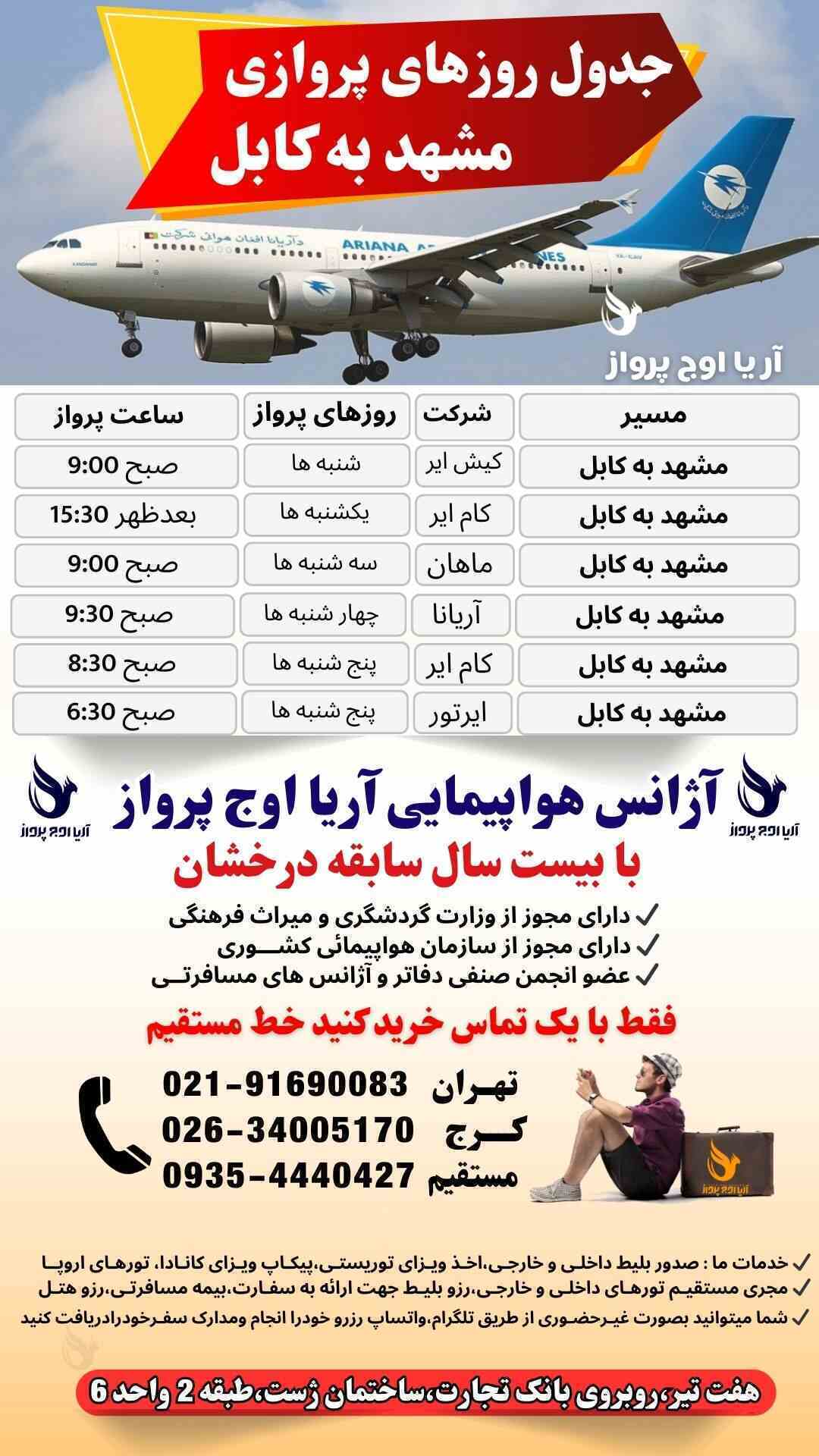 ✅ پروازهای تهران و مشهد به افغانستان - آریا اوج پرواز