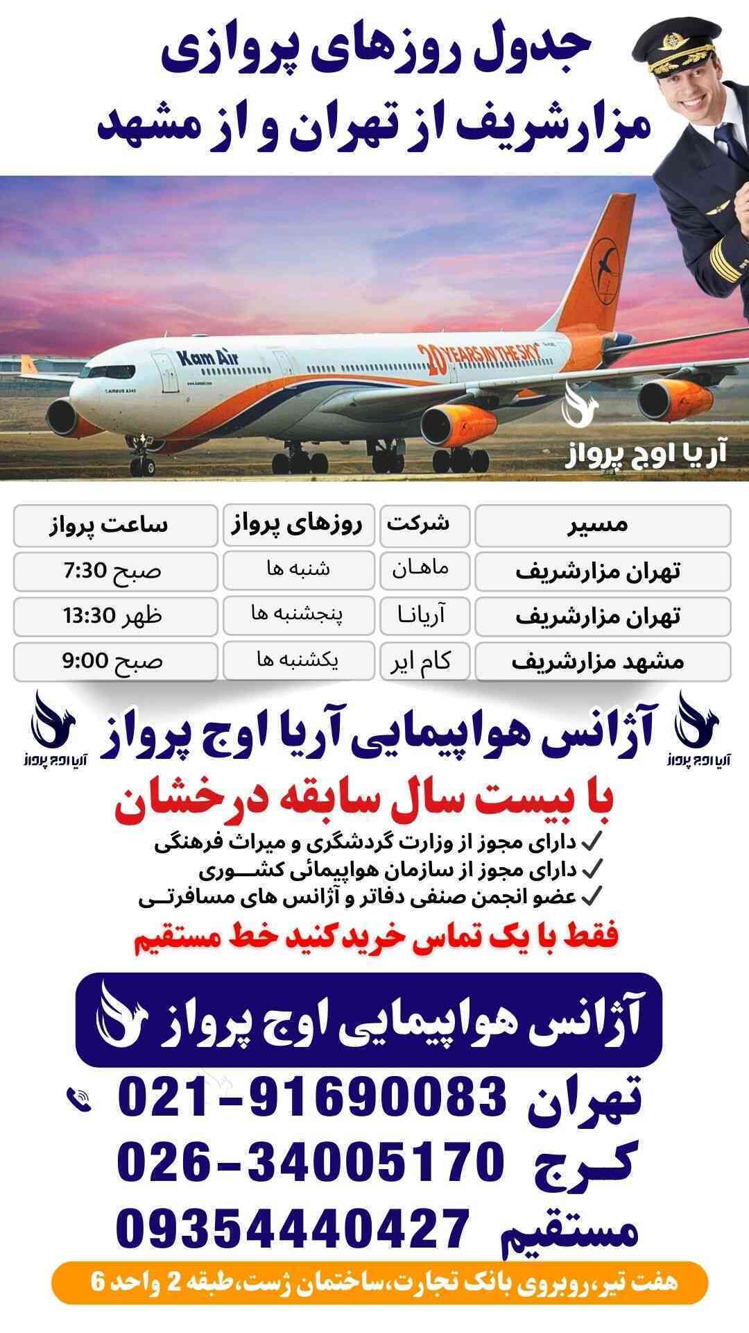 ✅ آریا اوج پرواز؛ ارائه بلیطهای چارتری و سیستمی تهران و مشهد به افغانستان
