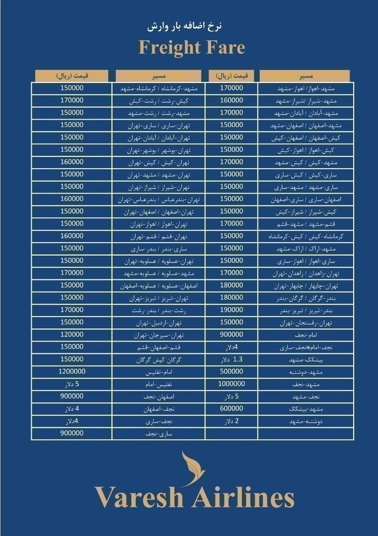 - نرخ اضافه بار پروازهای داخلی و خارجی هواپیمایی وارش